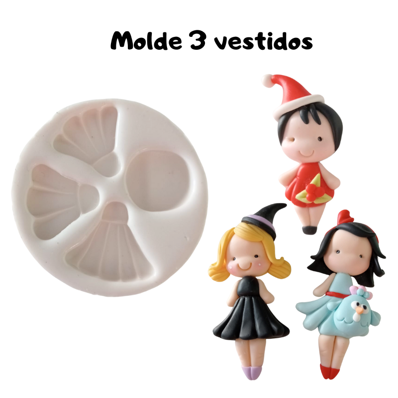 Molde com 3 vestidos Tamanho: 7cm U.V:1 Mais Informações: Molde de qualidade superior, produzido em Portugal